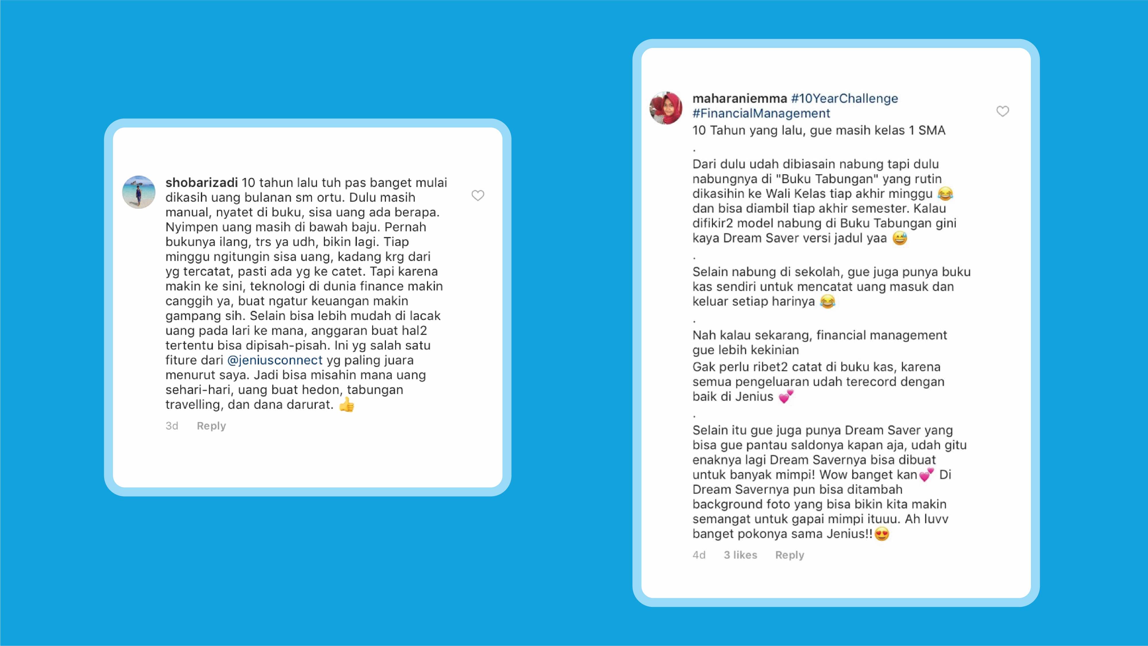 Banyak pengguna Jenius yang membagikan pengalaman #10YearChallenge mereka yang berhubungan dengan financial management di Instagram @jeniusconnect nih. Apakah kamu juga punya pengalaman yang sama dengan mereka?