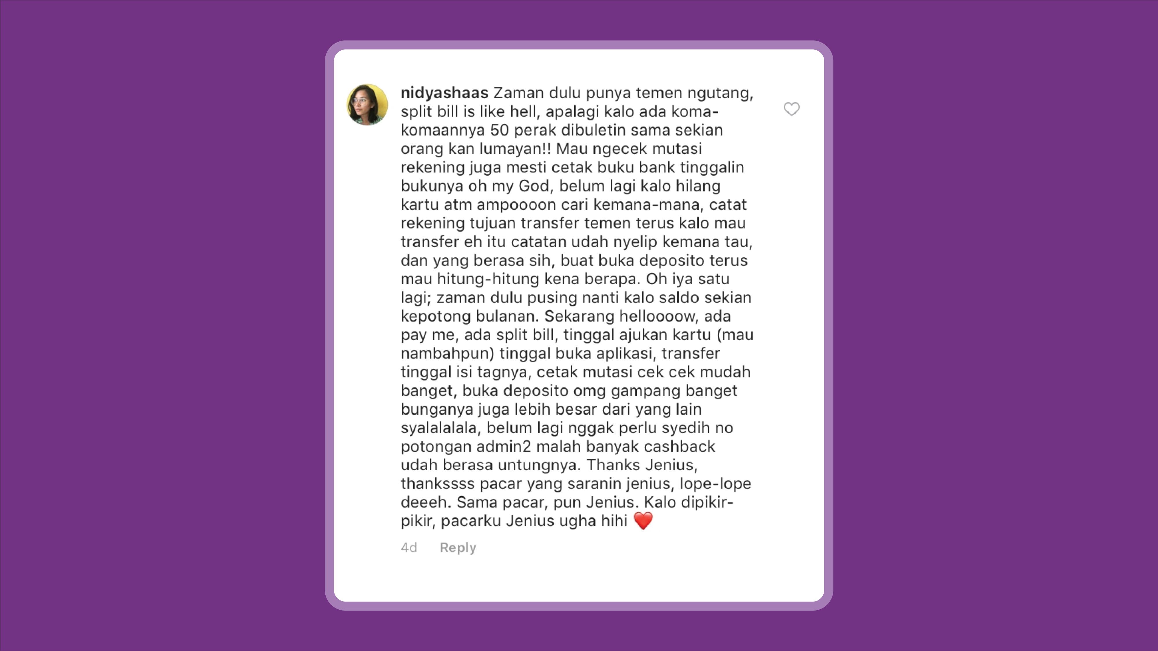 Benar banget nih, apa kata @nidyashaas: sekarang kamu bisa buka deposito, dengan bunga hingga 4.25% p.a., di mana dan kapan saja, lho. Dengan fitur Maxi Saver, kamu bahkan bisa membuat deposito baru sebelum tidur! Kamu gak perlu lagi deh menghabiskan waktu untuk datang dan mengantre untuk bertemu CSO di kantor cabang.