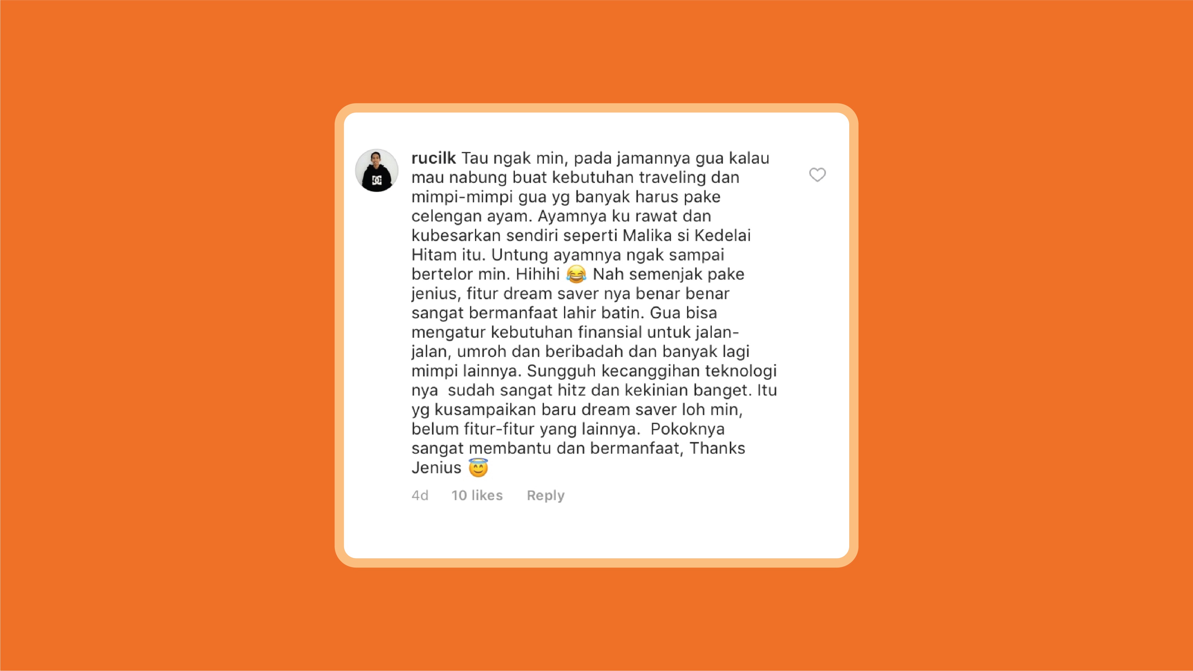 Sementara untuk celengan atau amplop tabungan, kamu bisa menggunakan fitur Dream Saver di Jenius seperti yang dilakukan oleh @rucilk. Kamu tidak akan kelewatan jadwal menabung karena saat membuatnya, kamu bisa langsung mengatur berapa uang yang mau kamu tabung, dan kapan saja uang tersebut mau dipisahkan dari Saldo Aktif.