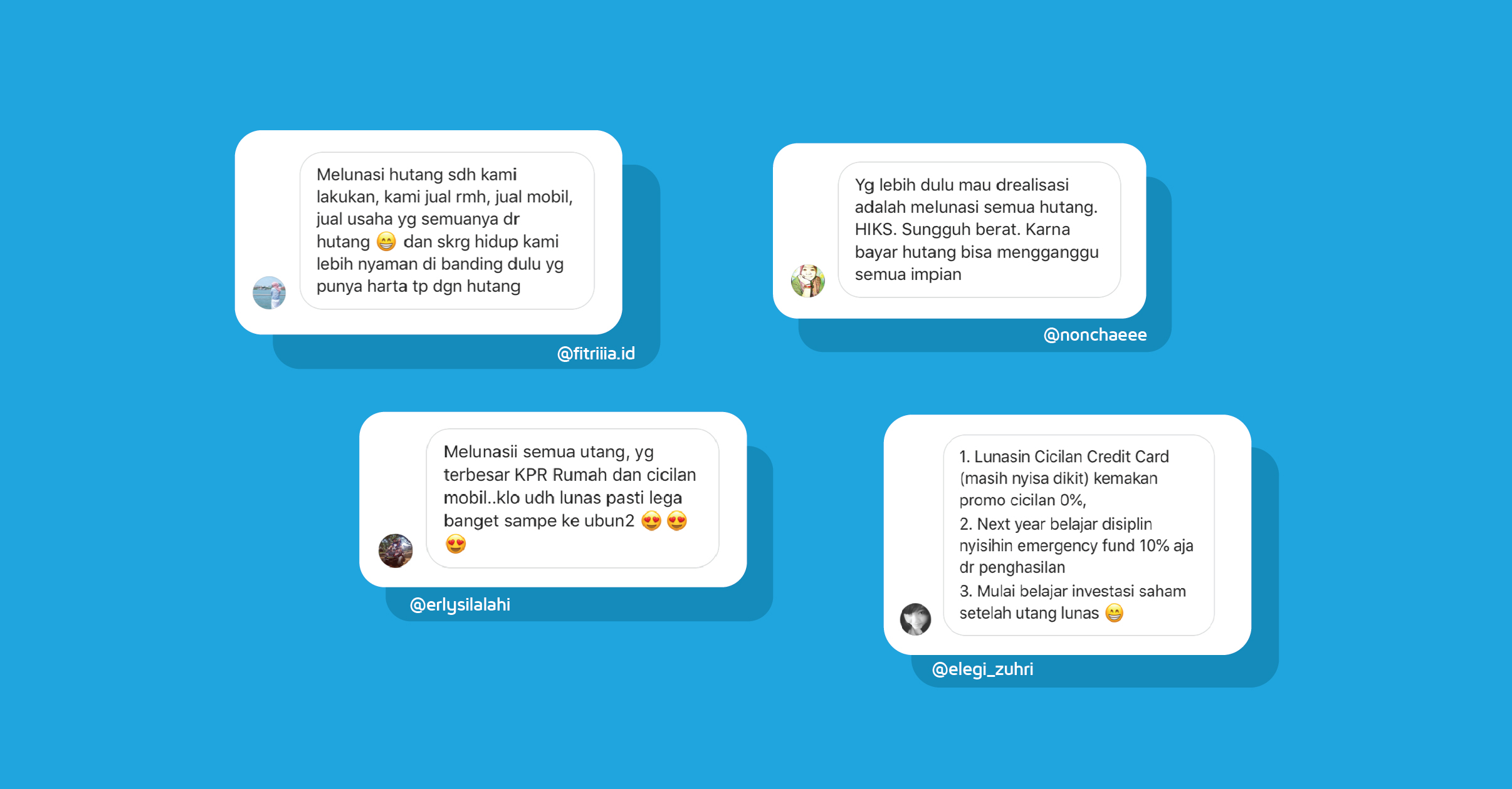 Hal utama yang wajib dilakukan untuk menggapai mimpi-mimpi terkait finansial adalah melunasi utang, khususnya utang konsumtif. Bayang-bayang utang, apalagi yang nominalnya cukup besar, pasti akan mengganggu pikiran.