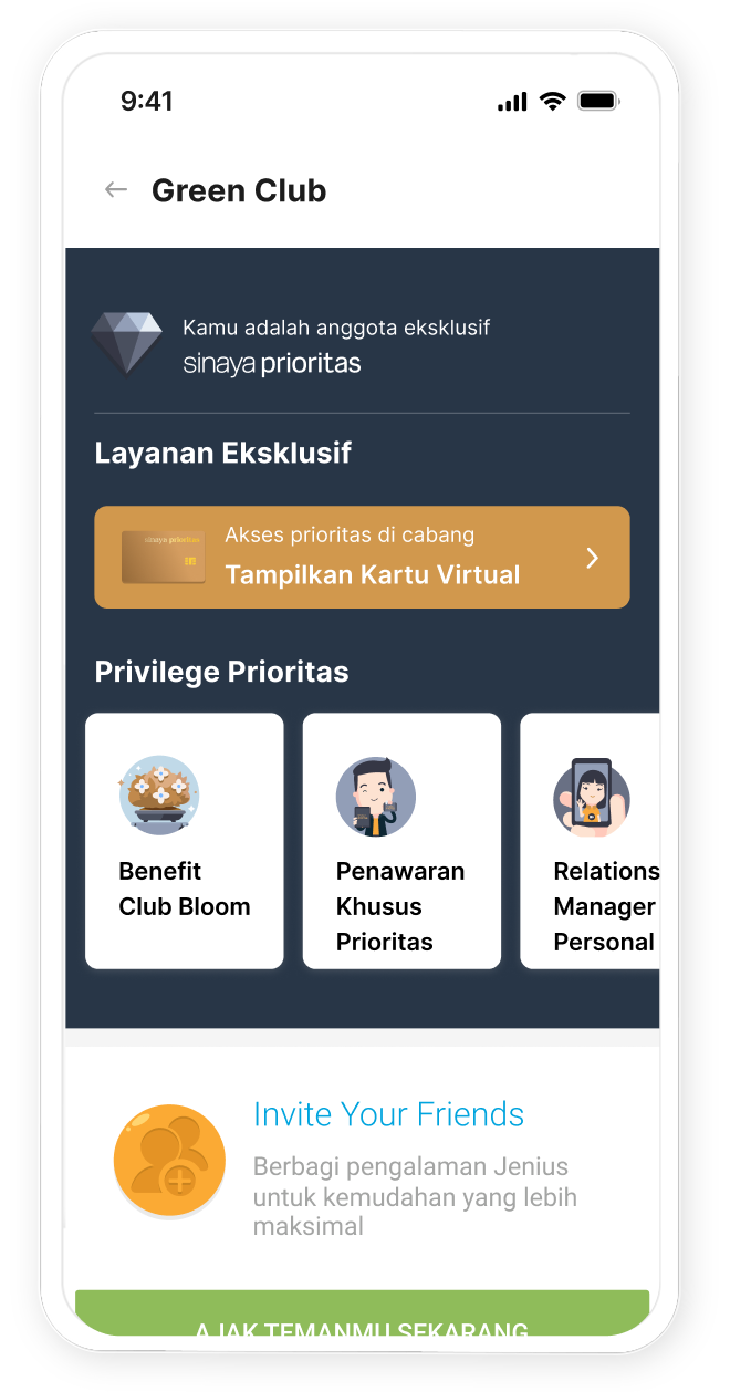 Nasabah Sinaya Prioritas di Jenius juga mendapatkan benefit dari Green Club Bloom Jenius, program kategorisasi untuk Nasabah dengan saldo rata-rata per bulan min. Rp500.000.000, seperti: