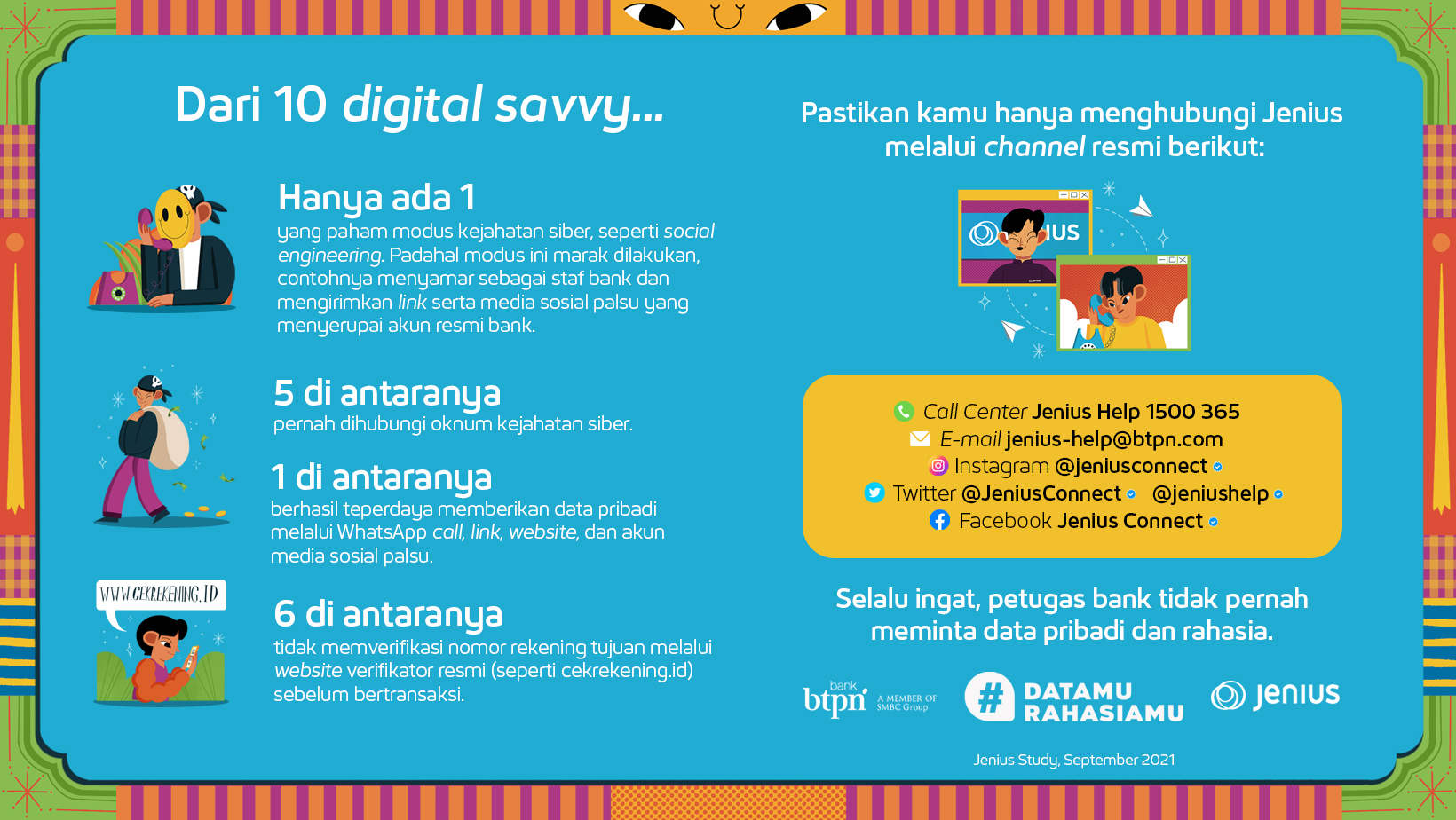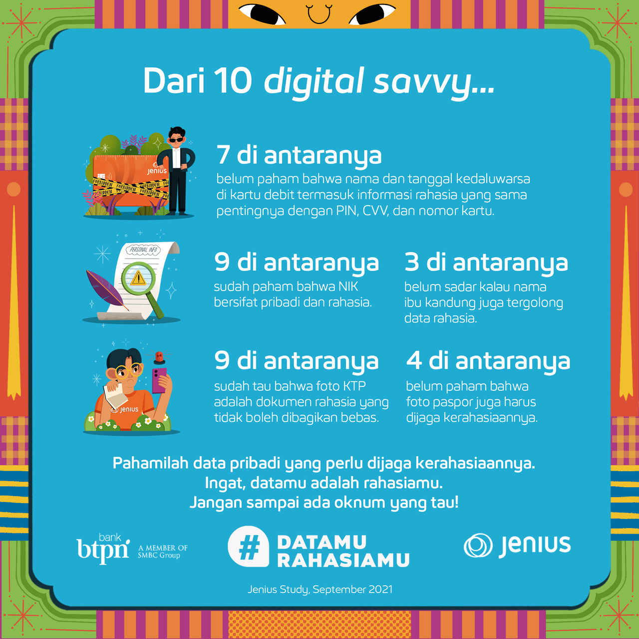 Hasil survei ini membuktikan, masih ada banyak digital savvy yang perlu edukasi mengenai data apa saja yang perlu dirahasiakan. Karena, sistem Jenius bisa berjalan optimal untuk menjagamu, hanya bila kamu tau dan berperan penuh menjaga kerahasiaan data-data tersebut.