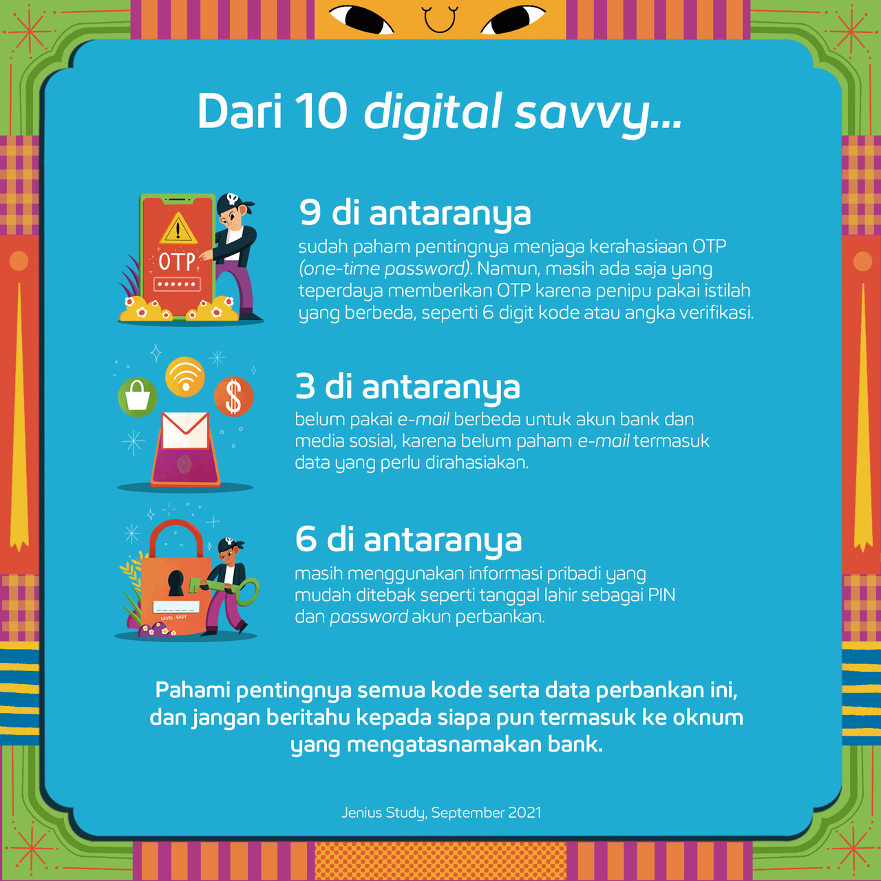 Dari 10 digital savvy… 9 di antaranya sudah paham pentingnya menjaga OTP. Namun, masih ada saja yang teperdaya memberikan 6 digit rahasia tersebut kepada oknum kejahatan siber.