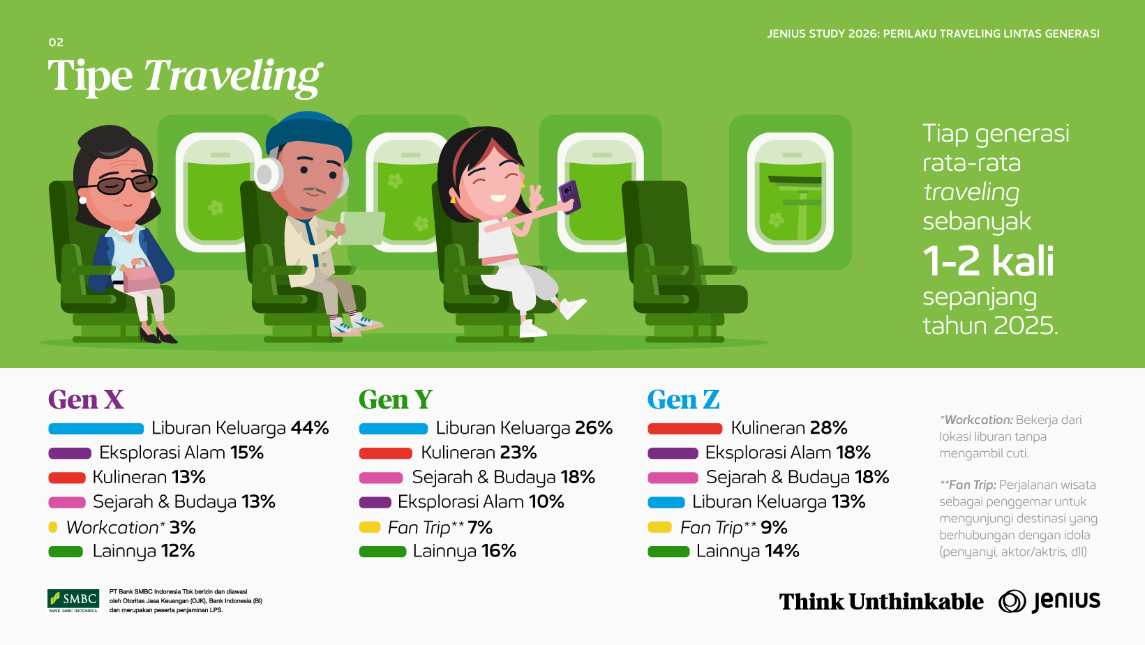 Dilihat dari hasil survei Jenius Study 2026: Perilaku Traveling Lintas Generasi, tipe perjalanan yang dipilih tiap generasi punya perbedaan tujuan.