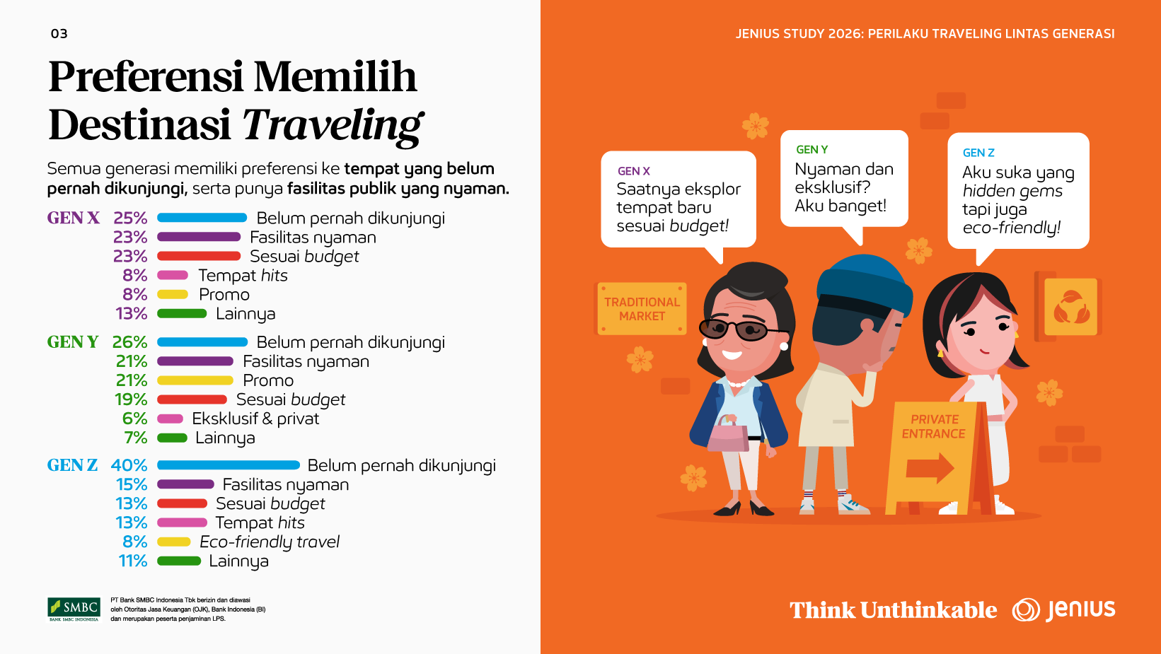 Jenius Study menunjukkan dalam memilih destinasi traveling, semua generasi tertarik pada tempat yang belum pernah dikunjungi dan fasilitas publik yang nyaman. Yang membedakan adalah detailnya.