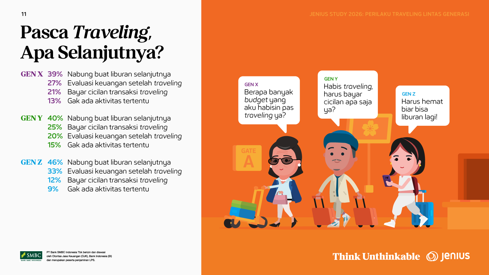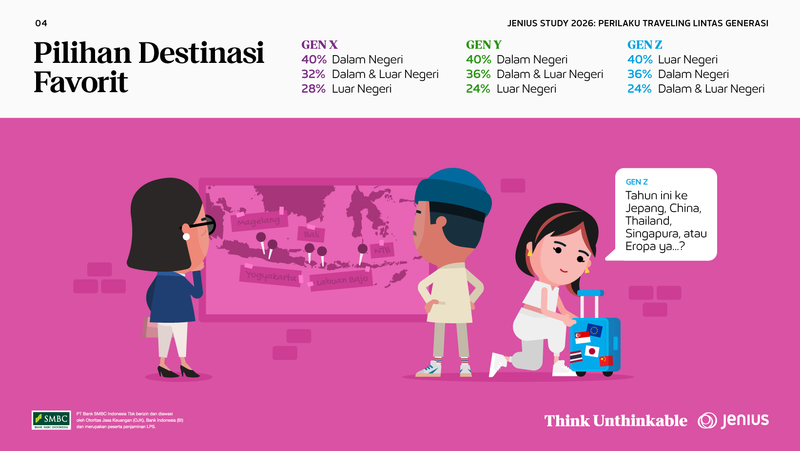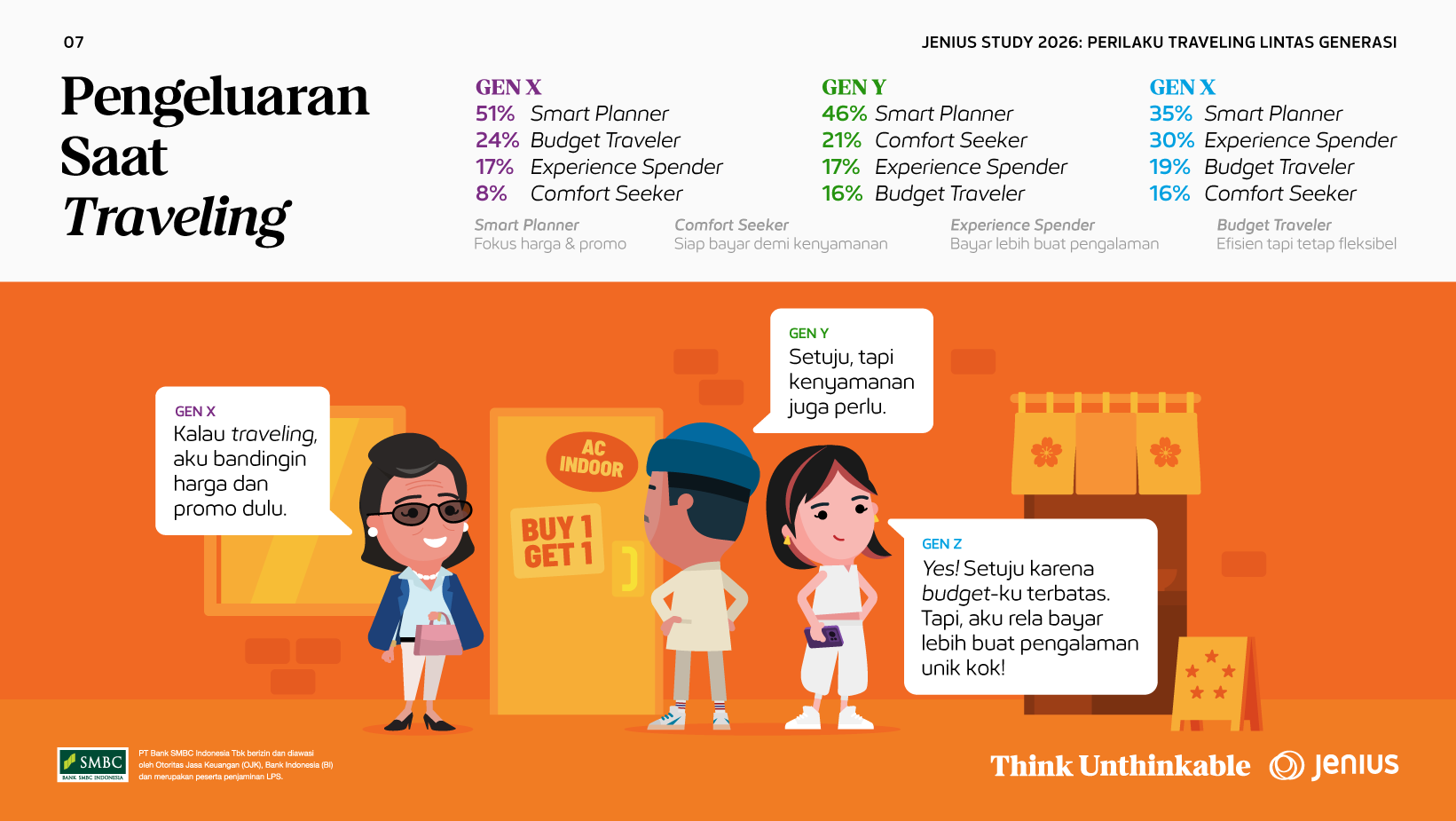 Melalui Jenius Study 2026: Perilaku Traveling Lintas Generasi yang melibatkan 300 responden melalui online survey dan wawancara mendalam yang dilaksanakan pada November 2025 sampai Januari 2026, Jenius melihat bagaimana Gen X, Gen Y, dan Gen Z merancang perjalanan traveling mereka.