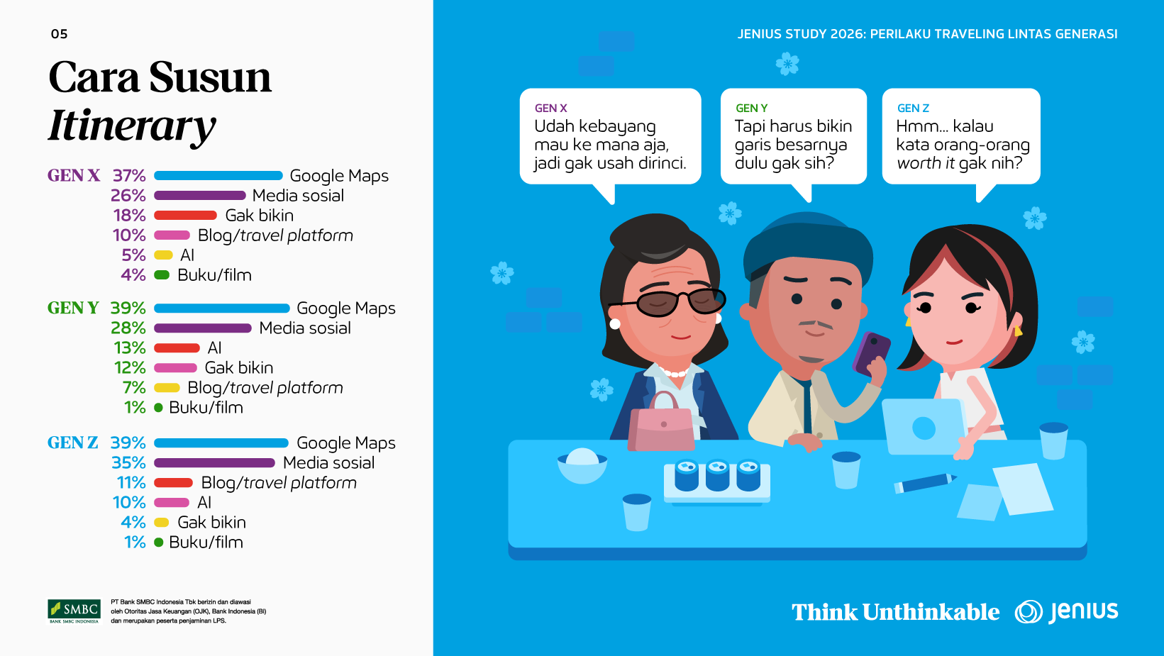 Menariknya, hasil Jenius Study 2026: Perilaku Traveling Lintas Generasi menunjukkan bahwa tiap generasi sama-sama mengandalkan platform digital untuk menyusun itinerary, yang mana Google Maps dan media sosial jadi dua sumber utama.