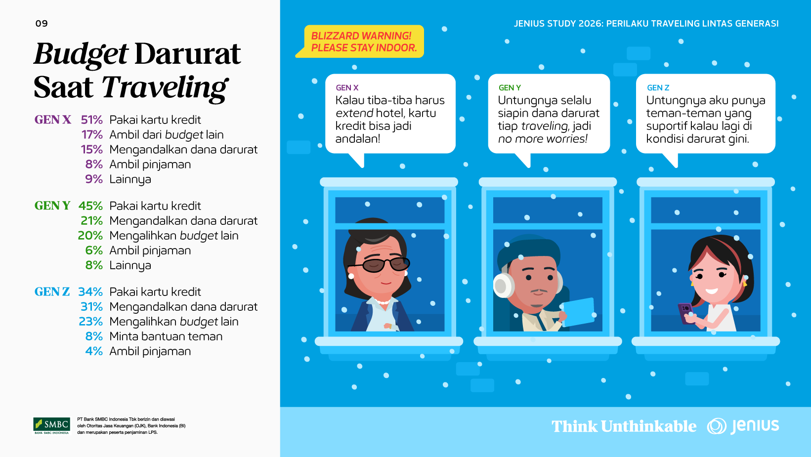 Saat menghadapi kondisi gak terduga ketika traveling, hasil dari Jenius Study 2026: Perilaku Traveling Lintas Generasi menunjukkan tiap generasi menggunakan kartu kredit sebagai solusi utama.