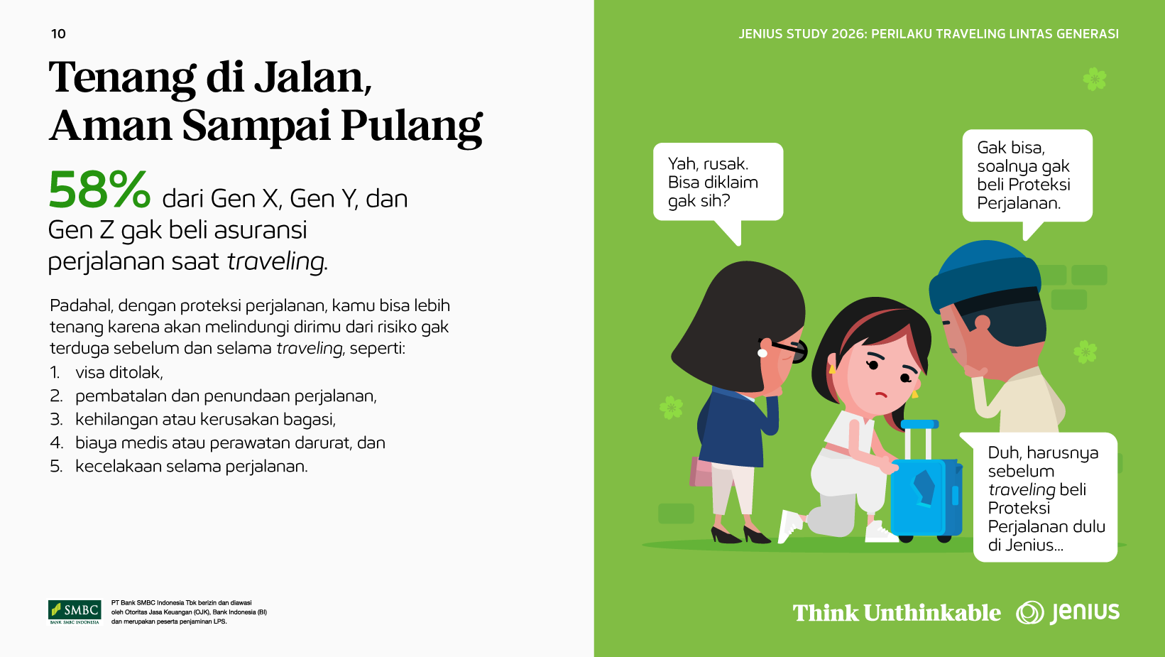 Angka ini menarik karena di sisi lain kita melihat generasi makin terencana dalam budgeting, makin digital dalam menyusun itinerary, dan makin sadar pentingnya dana darurat. Namun, proteksi perjalanan masih belum jadi prioritas utama.