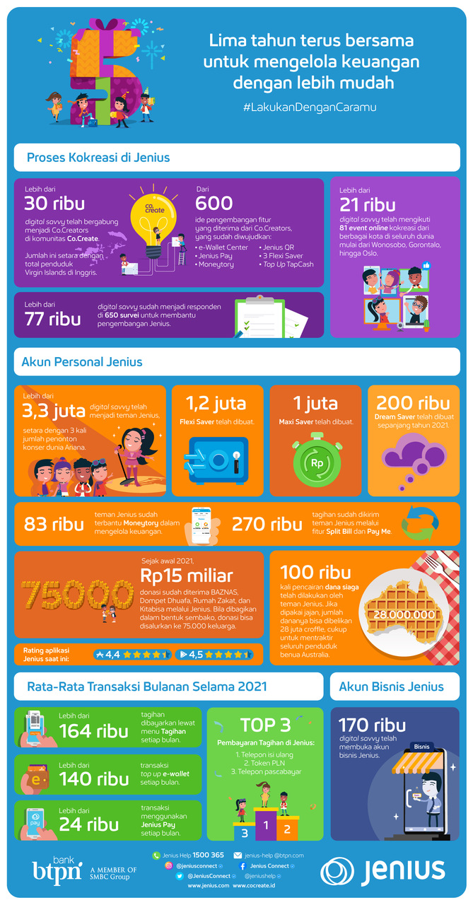 Sudah lima tahun Jenius hadir untuk menemani masyarakat digital savvy mengelola keuangan dengan lebih mudah. Lima tahun rasanya belum terlalu lama, tapi juga tidak bisa dibilang singkat.