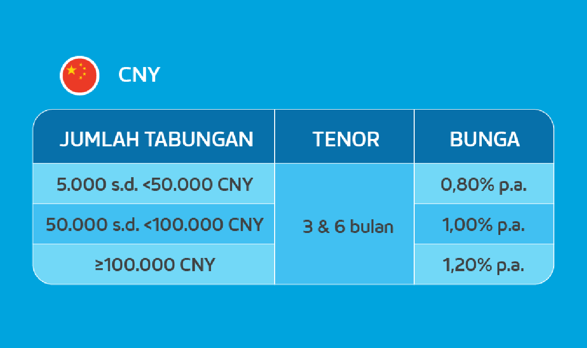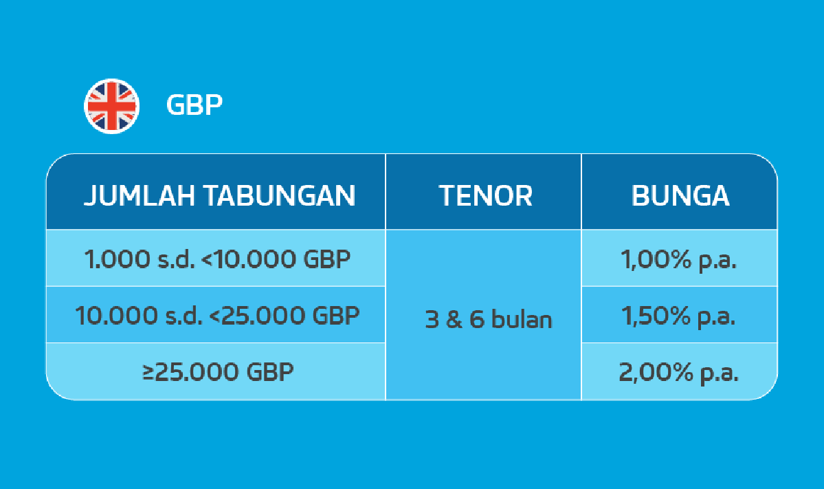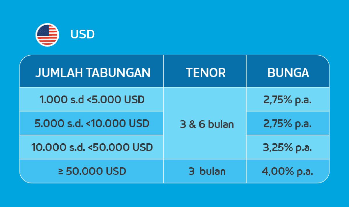 Dengan pilihan mata uang yang beragam dan bunga yang menarik , kamu bisa maksimalkan tabungan mata uang asing sesuai beragam kebutuhan finansialmu, misalnya: