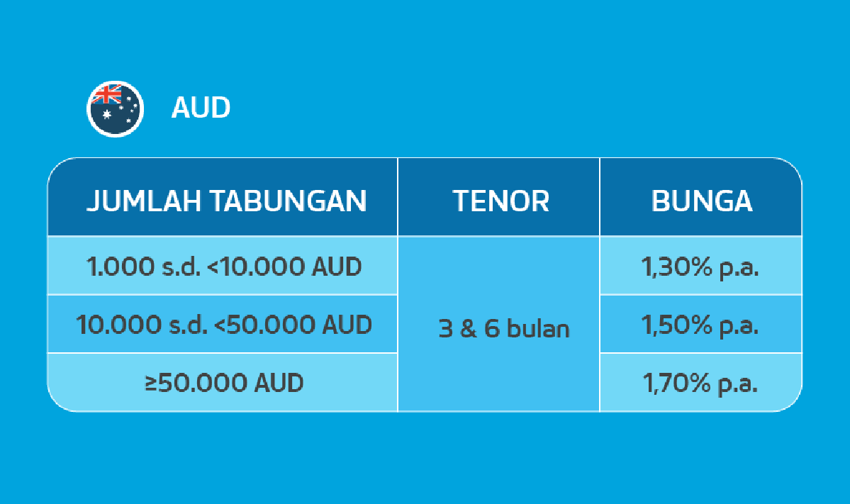 Untuk nabung mata uang asing di Maxi Saver, kamu bisa pilih jangka waktu 3 atau 6 bulan dan mulai nabung dengan nominal: