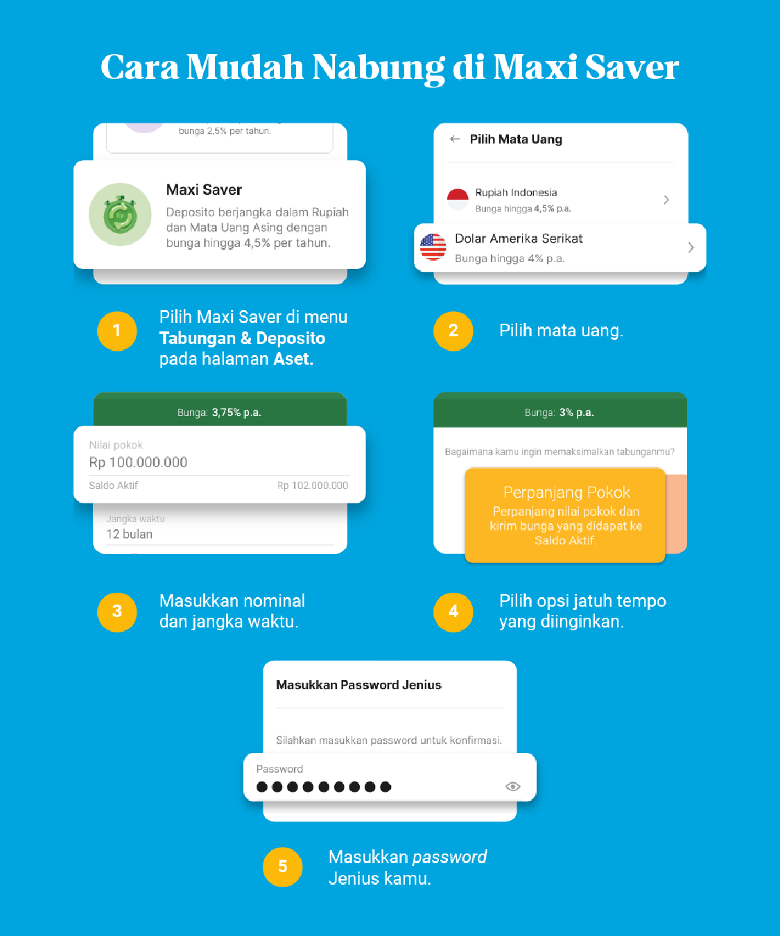 Nah, kabar baiknya, tabungan mata uang asing milikmu bisa bertumbuh dengan maksimal lewat Maxi Saver di Jenius. Karena kini Maxi Saver hadir dengan 6 pilihan mata uang asing dan bunga kompetitif maksimal 4% p.a. yang membantumu mempersiapkan apa pun kebutuhanmu.