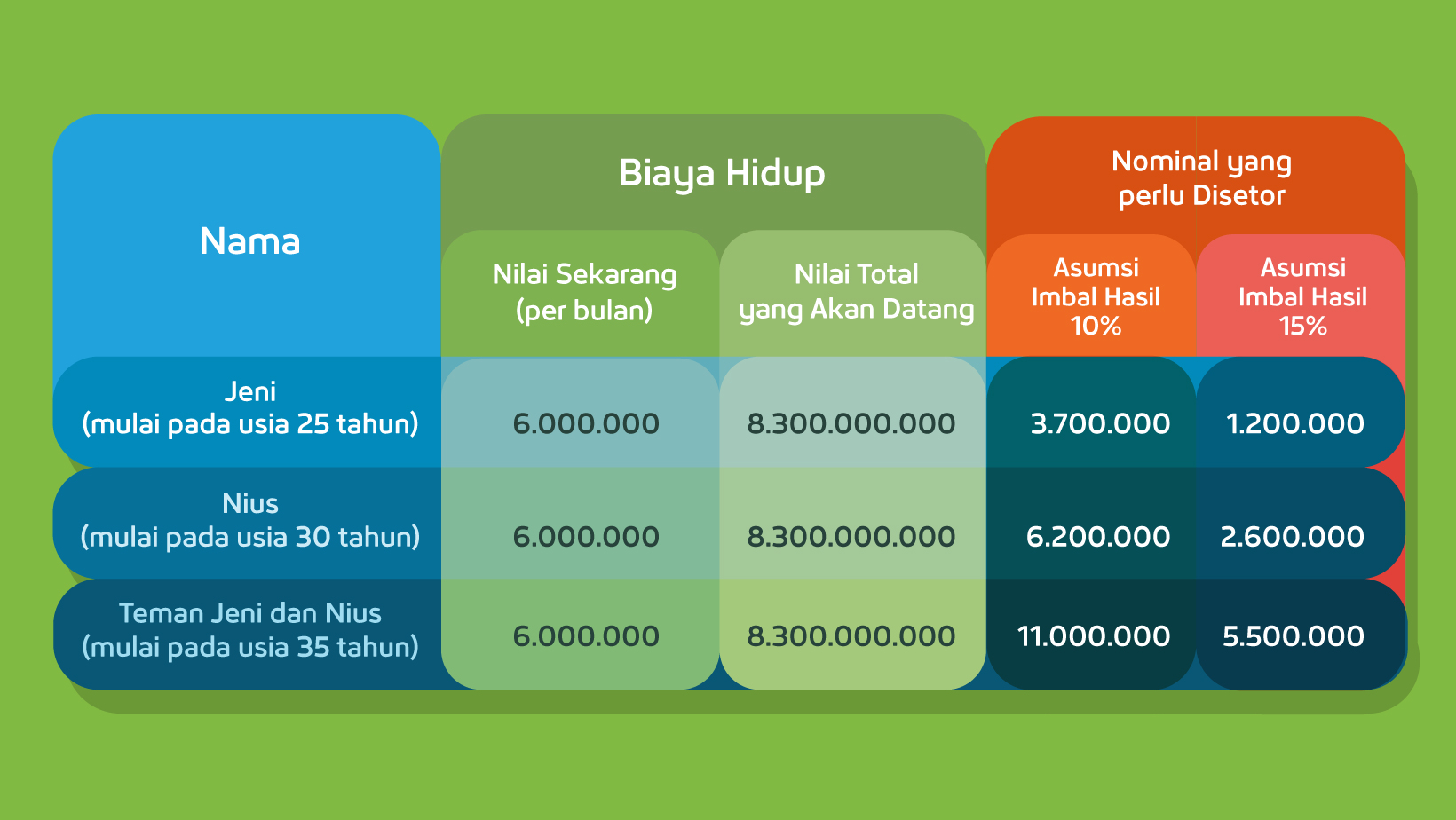 Sementara itu, berbeda dengan Jeni, Nius baru terpikir untuk menyiapkan dana pensiun pada usia 30 tahun. Ya, lima tahun setelah Jeni mulai. Kira-kira bagaimanakah hasil tabungan dana pensiun mereka?