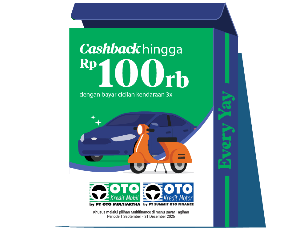 - Dapatkan cashback hingga Rp100.000 dengan melakukan 3 kali pembayaran berturut-turut untuk cicilan produk Dana Tunai OTO Kredit Mobil atau OTO Kredit Motor lewat menu Bayar Tagihan/Virtual Account (VA) di aplikasi Jenius: