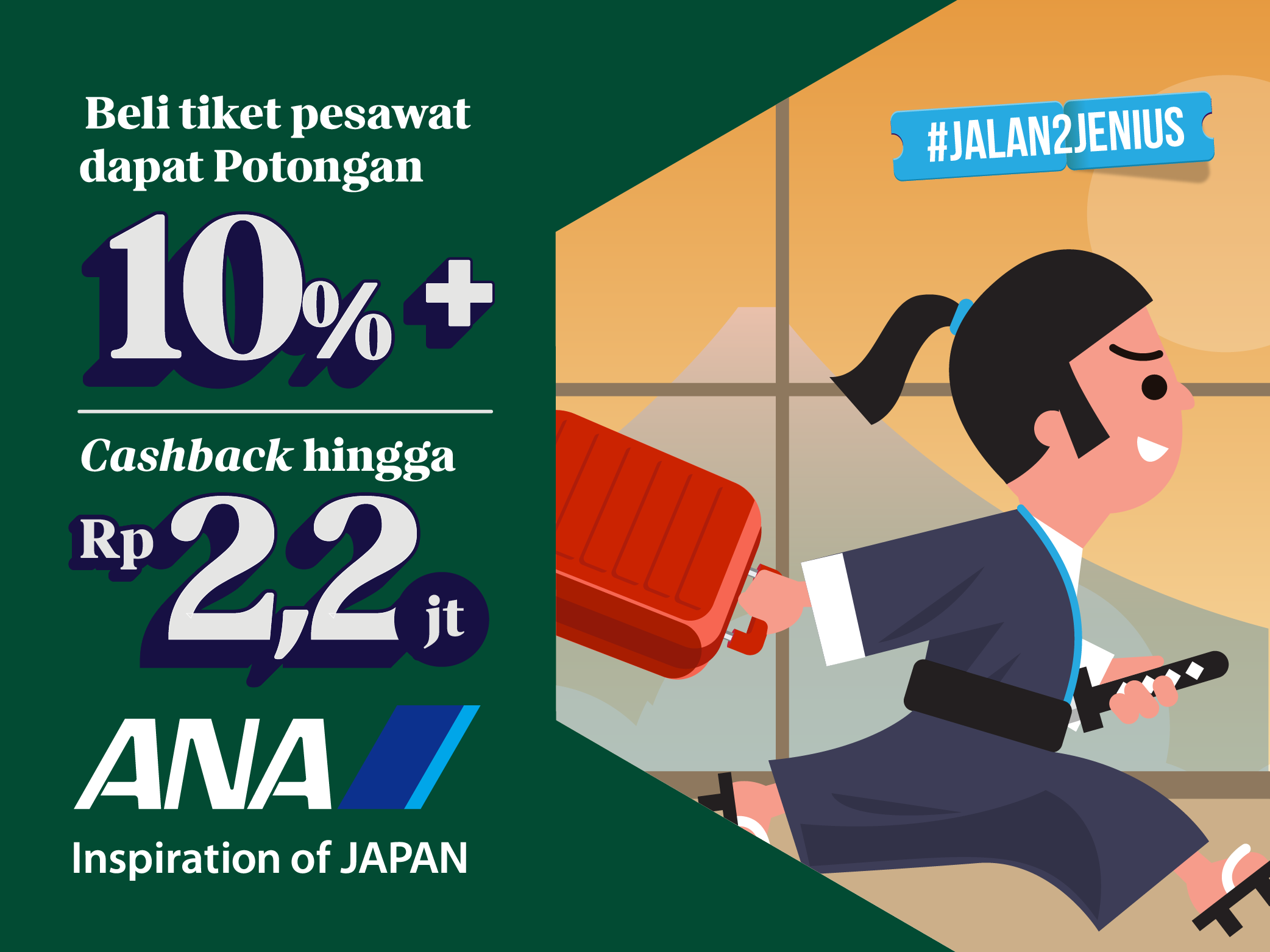 Jalan-jalan lebih hemat dengan potongan 10% di All Nippon Airways dengan Kartu Jenius dan dapatkan tambahkan cashback hingga Rp2,2 juta.