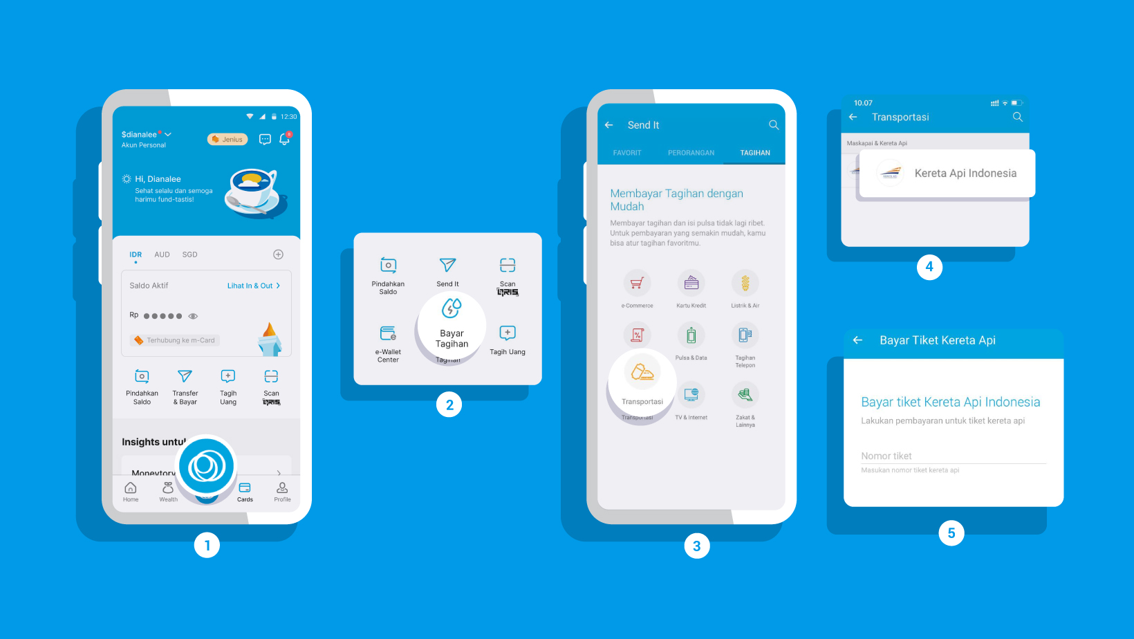 Caranya, kamu tinggal pilih tombol Mobius (yang berlogo Jenius) di tengah dan pilih menu Bayar Tagihan. Pilih Transportasi, lalu Kereta Api Indonesia, dan masukkan nomor tiket yang sudah kamu dapatkan saat beli di website/aplikasi KAI Access.