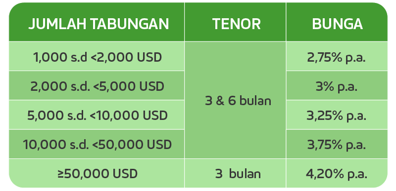 Untuk nabung di Maxi Saver USD, kamu bisa mulai dengan nominal minimal USD 1.000, dan pilih jangka waktu 3 atau 6 bulan. Berikut detail suku bunga dari Maxi Saver USD: