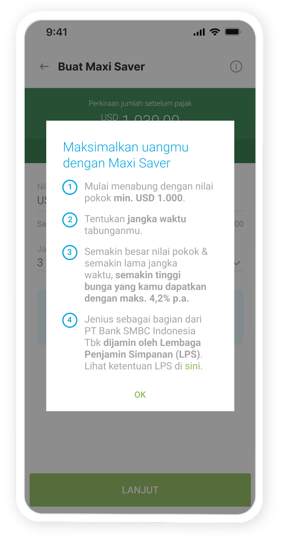 Maxi Saver sendiri adalah fitur deposito berjangka di Jenius yang bisa dibuat dalam Rupiah maupun Dolar AS. Khusus Maxi Saver USD, kamu bisa mendapatkan suku bunga maksimal hingga 4,2% p.a.—cocok buat kamu yang ingin nabung dan menumbuhkan uangmu!