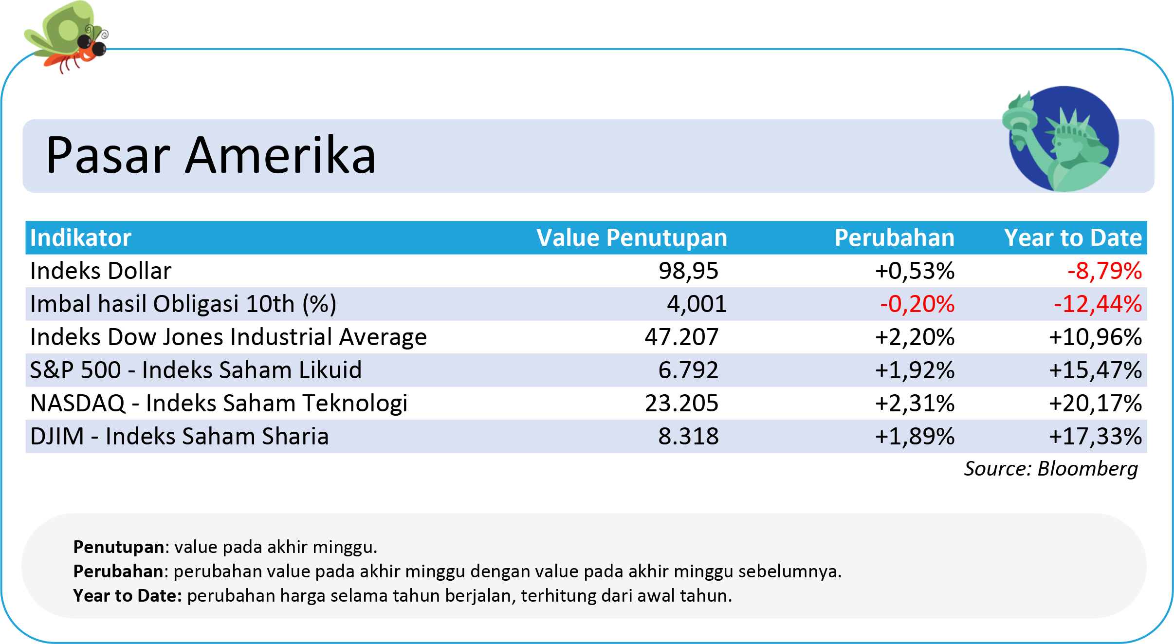 Pasar Amerika Serikat menjalani minggu perdagangan penuh gejolak, yang mana arah indeks didorong oleh tarik-ulur yang kuat antara dua faktor utama: optimisme dari musim laporan keuangan dan kekhawatiran yang timbul tenggelam seputar hubungan dagang Amerika Serikat dan Tiongkok.