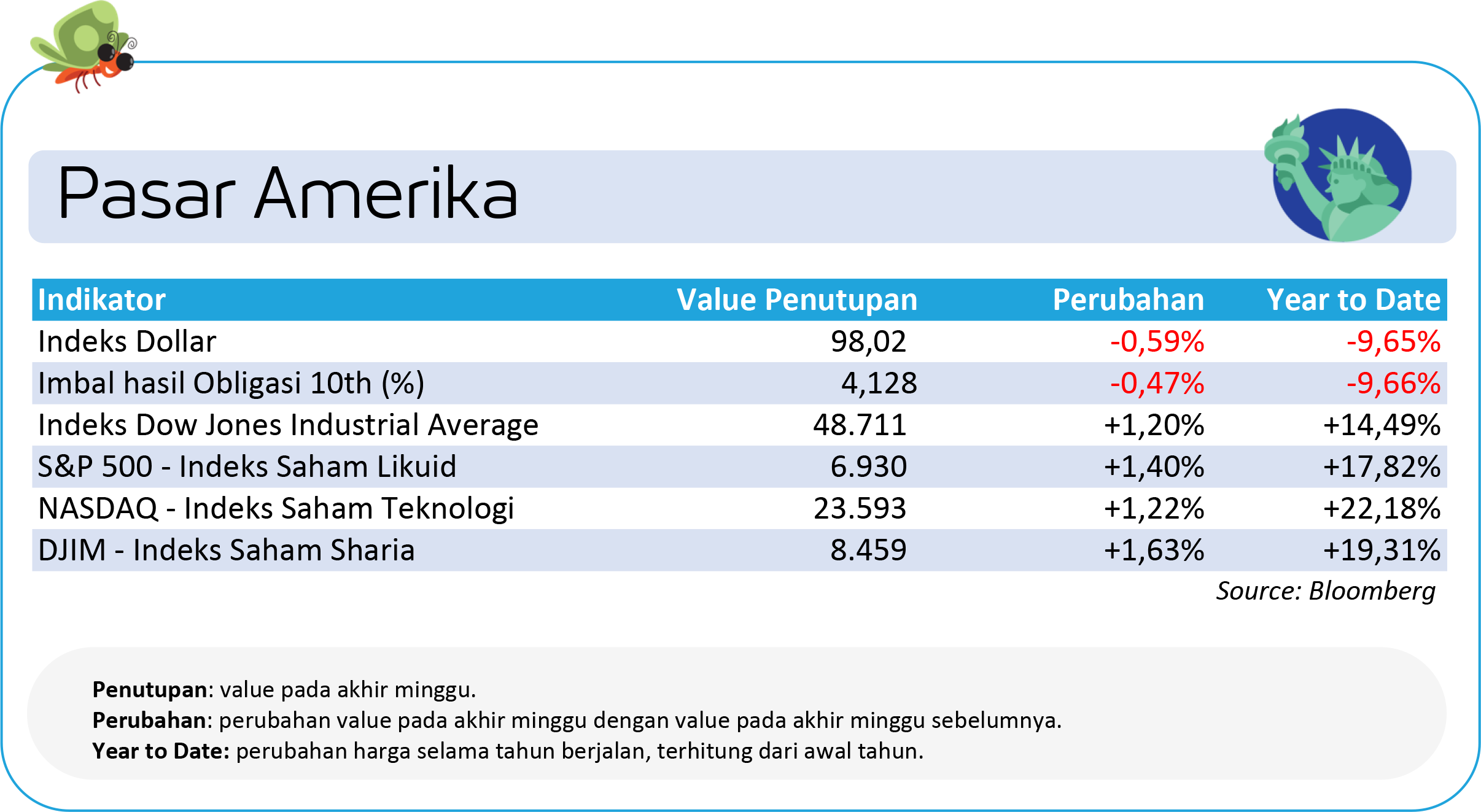 Secara keseluruhan, pasar ekuitas menguat pekan lalu seiring dengan membaiknya selera risiko dan harapan penguatan pasar menjelang akhir tahun.