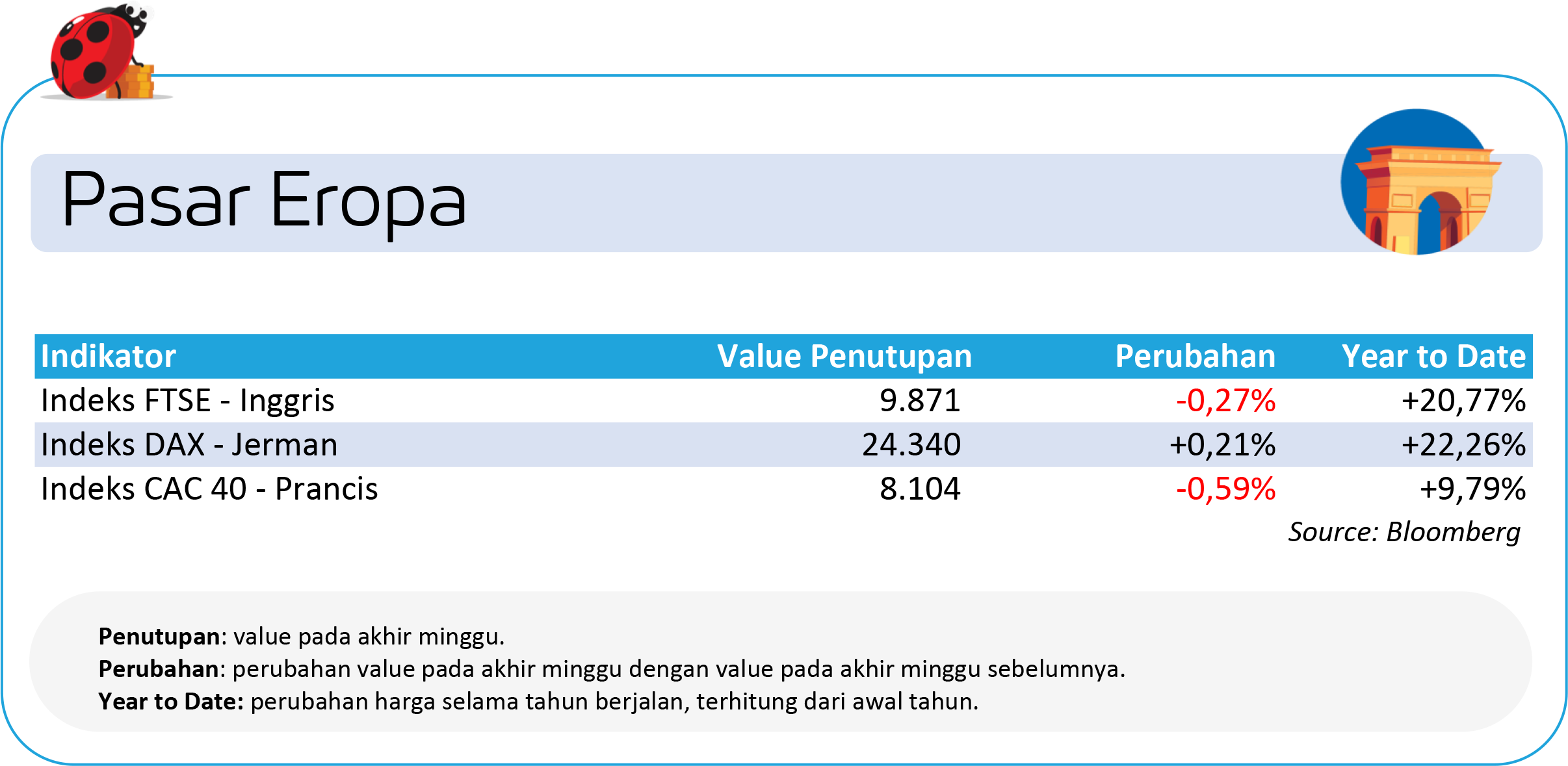 Meski risiko pengetatan kebijakan semakin kecil, kehati-hatian masih mendominasi karena ketidakpastian pemulihan permintaan dan prospek laba perusahaan, sehingga pasar Eropa menutup pekan dengan pergerakan yang terbatas.